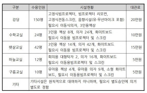 4. 사용료 : 사용료는 대관수익이 아니라, 장소사용에 따른 수도, 전기, 냉난방비,장비 사용 등에 따른 실비이며 다음과 같습니다.