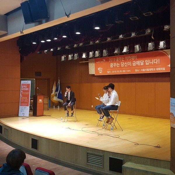 꿈꾸는 아카데미가 시작되었습니다~ 꿈날개클럽, 꿈꾸는아이들에 참여하는 청소년 2명이 MC를 맡아 양학선 선수와의 토크쇼를 진행하였습니다!