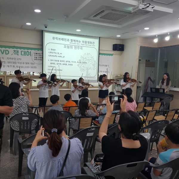 뮤직브레인팀의 연주로 마을 영화관이 시작되었습니다.