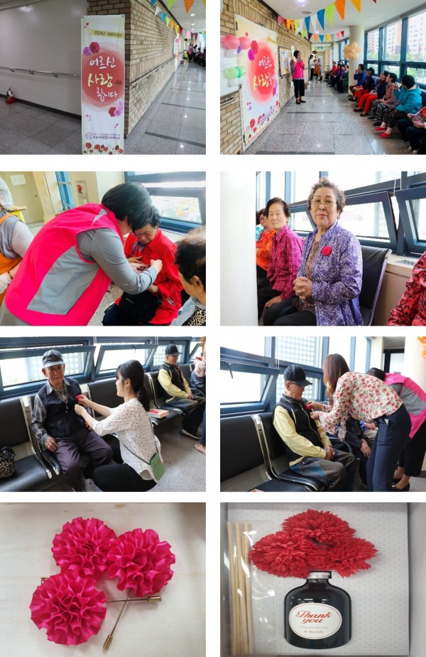 직원들이 어르신 한분 한분 모두 인사드리며 가슴에 카네이션을 직접 달아드렸고, 어버이날에 카네이션을 달아주는 사람이 있어 너무 즐겁고 행복하다는 이야기를 많이 하셨습니다.