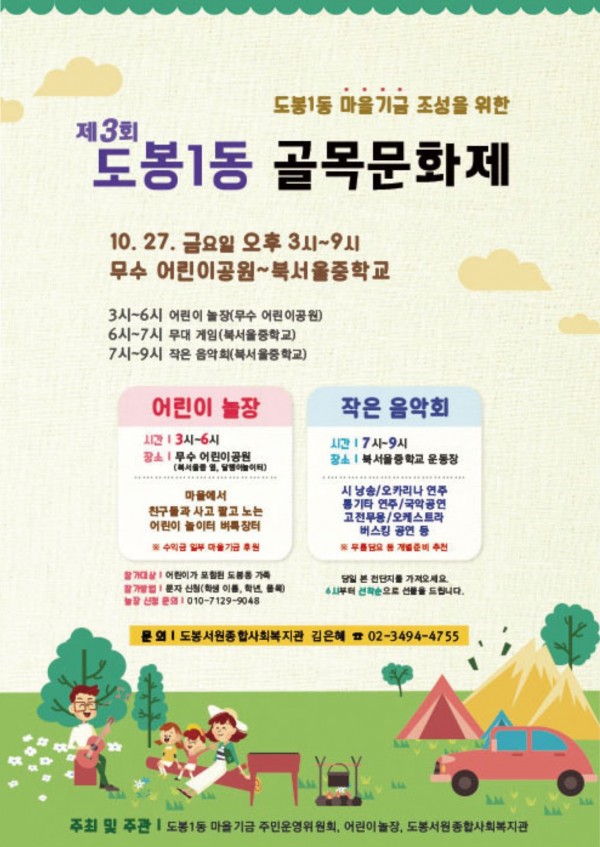 * 내용 : 어린이 놀장 플리마켓, 사회자 게임, 도봉1동 마을기금 홍보부스, 다양한 음악공연 등