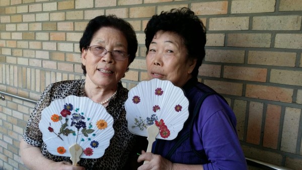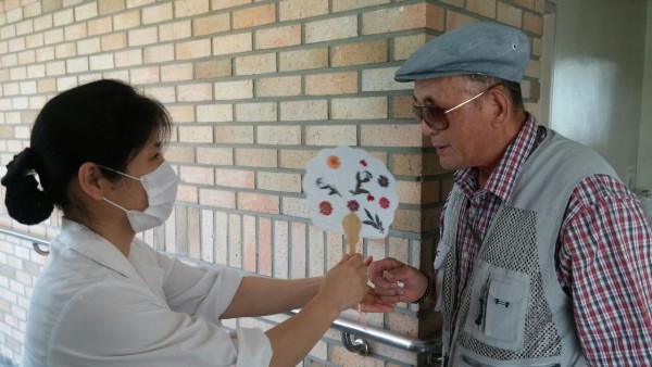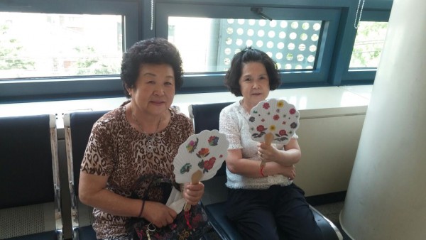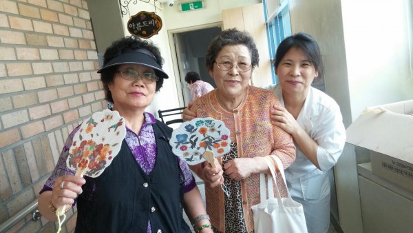 압화부채 받고 좋아하시는 어르신들의 모습입니다.