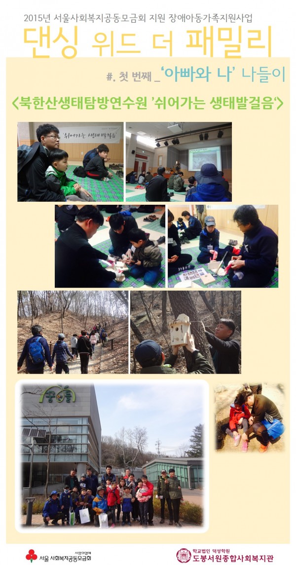 * 내용 : 부자 통합 나들이 - 북한산생태탐방연수원 숲체험 프로그램(국립공원의 새 안내, 새집만들기, 산책 및 새집 달기)