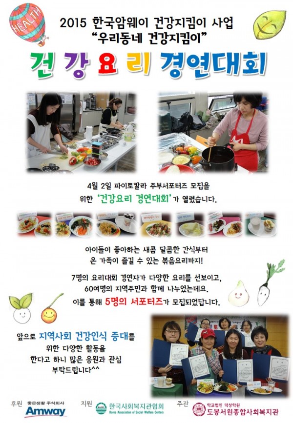 아동의 균형 있는 식습관을 형성하고 지역 내 영양네트워크 형성을 통해 지역사회 건강인식 증대를 위한 아동-보호자-지역사회를 대상으로 진행하는 2015 한국암웨이 건강지킴이사업 '우리동네 건강지킴이-파이토칼라특공대 season2'에 참여할 주부서포터즈 모집을 위해 지난 2일 "건강요리 경연대회"를 개최하였습니다.
