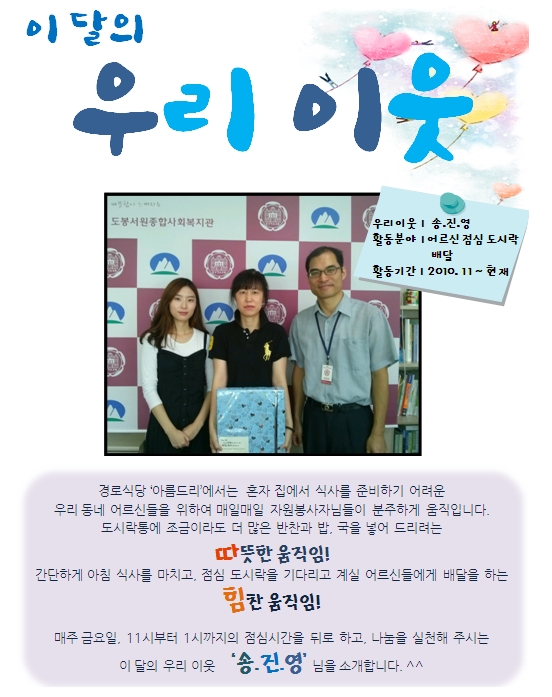 [자원봉사자관리]이달의 우리 이웃 '송진영'님을 소개합니다.^^