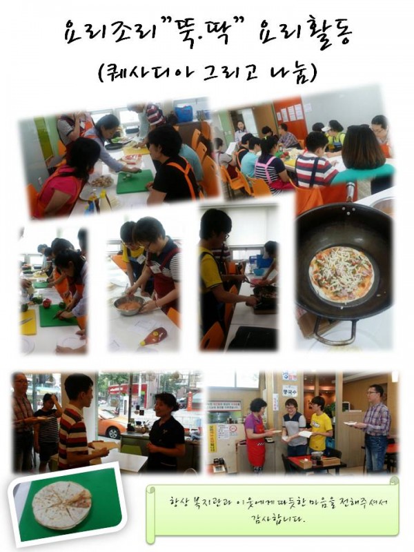 또한 지역 내 늘 이웃들에게 따뜻한 마음을 전해주시는 민들레김밥과 황제짬뽕에 방문하여 성인발달장애인 6명과 지역주민 6명이 사랑으로 만든 퀘사디아 나눔활동을 진행하였습니다.