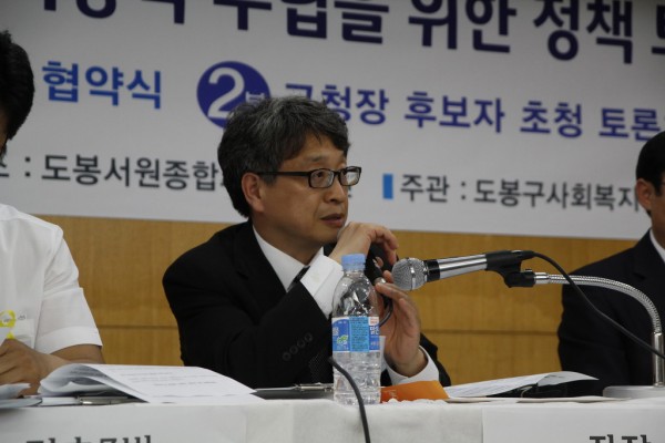 지난 5월23일 도봉구사회복지협의회(송건회장, 도봉지역자활센터관장)가 주관하여 ‘도봉구 복지공약수립을 위한 정책토론회를 개최하였습니다. 1부에서는 도봉구사회복지협의회가 제안한 7대 공약 실천이행을 다짐하는 도봉구 시,구의원 매니패스토 협약식이 진행되었고, 2부에서는 구청장 후보 복지공약 정견 발표, 도봉구사회복지협의회에서 제안한 7대 복지정책 의제에 대한 답변, 자유토론순으로 진행되었습니다. 좌장은 이인재교수(한신대학교 사회복지학부 교수), 정책제안자는 도봉구사회복지협의회 이정호 부회장(도봉서원종합사회복지관 관장), 도봉구청장 후보는 새정치민주연합 이동진 후보, 통합진보당 후보가 참석하였으며 각 사회복지시설 기관장 및 관계자,지역주민 등 약 250여명이 참석하였습니다.