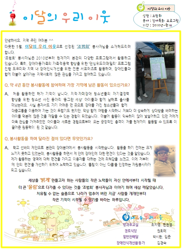 이달의 우리 이웃을 소개 합니다. - 장애특화 프로그램의 조범희 이웃님