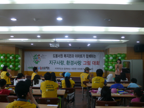 이날 행사에는 지구사랑 환경사랑 eco그림대회 및 환경사랑 장바구니 만들기, eco지킴이 선서 등의 내용으로 진행되었으며, 이마트 창동점 주부봉사단과 직원이 아동과 파트너가 되어 진행됨에 따라 더욱 의미있는 시간이 되었습니다.
