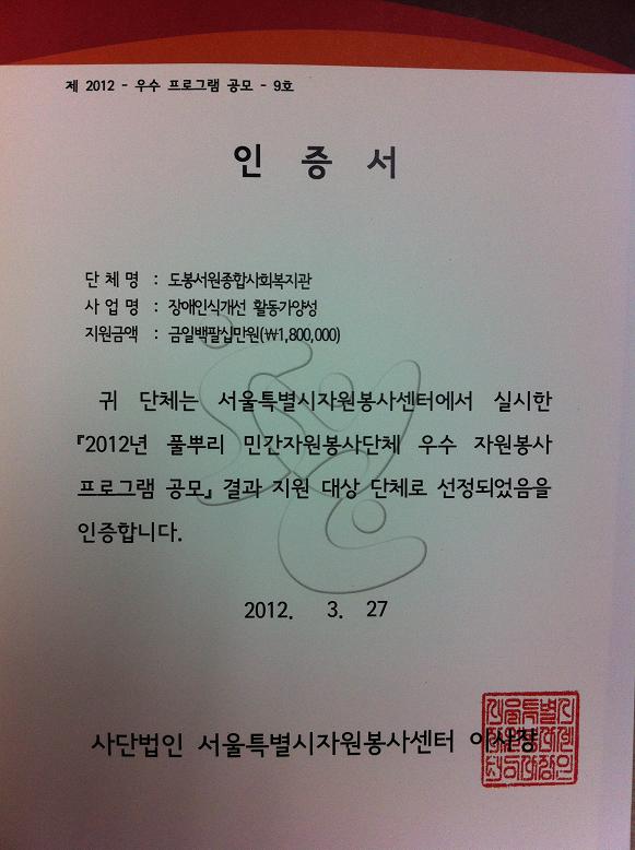 본관에서는 서울시 자원봉사센터에서 주관하는 2012년 풀뿌리 민간자원봉사단체 우수자원봉사 프로그램 공모사업에 지원하여 아래와 같이 선정되었습니다.