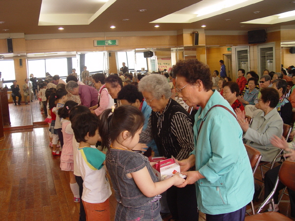 5월 8일 어버이날을 맞이하여 본관에서는 어르신 효도잔치를 진행하였습니다. 서원어린이집에서 준비한 떡과 고사리 손같은 어린이들이 할머니에게 인사를 드렸습니다.