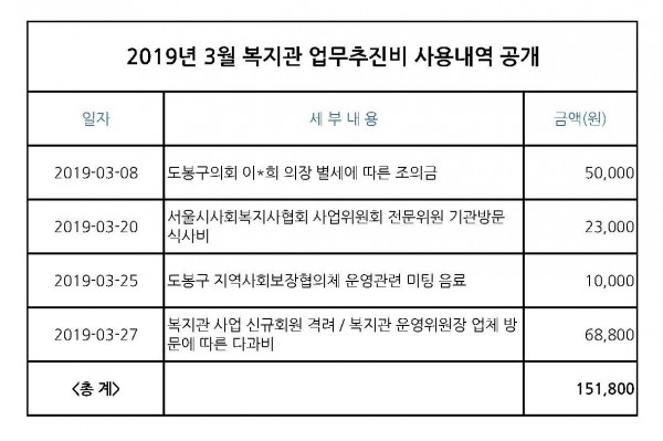 2019년 3월 도봉서원종합사회복지관 업무추진비 공개